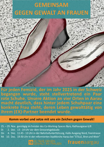 25 Paar blutrote Schuhe werden an vier verschiedenen öffentlichen Plätzen in der Stadt aufgestellt. Für jede Frau*, die im Jahr 2025 durch Partner oder Ex-Partner in der Schweiz getötet wurde, steht eines der Schuhpaare. Eine erschreckend hohe Zahl! Hinweise zum Alter der Frau, zum Ort und Datum der Tötung machen deutlich, dass hinter jedem Paar eine konkrete Frau* steht, deren Leben gewalttätig beendet wurde.